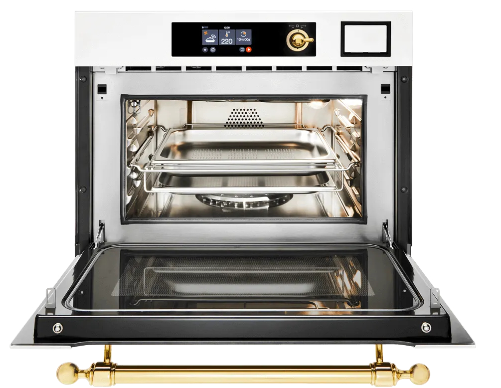 Многофункциональный компактный электрический духовой шкаф с функциями пароварки и микроволновой печи.