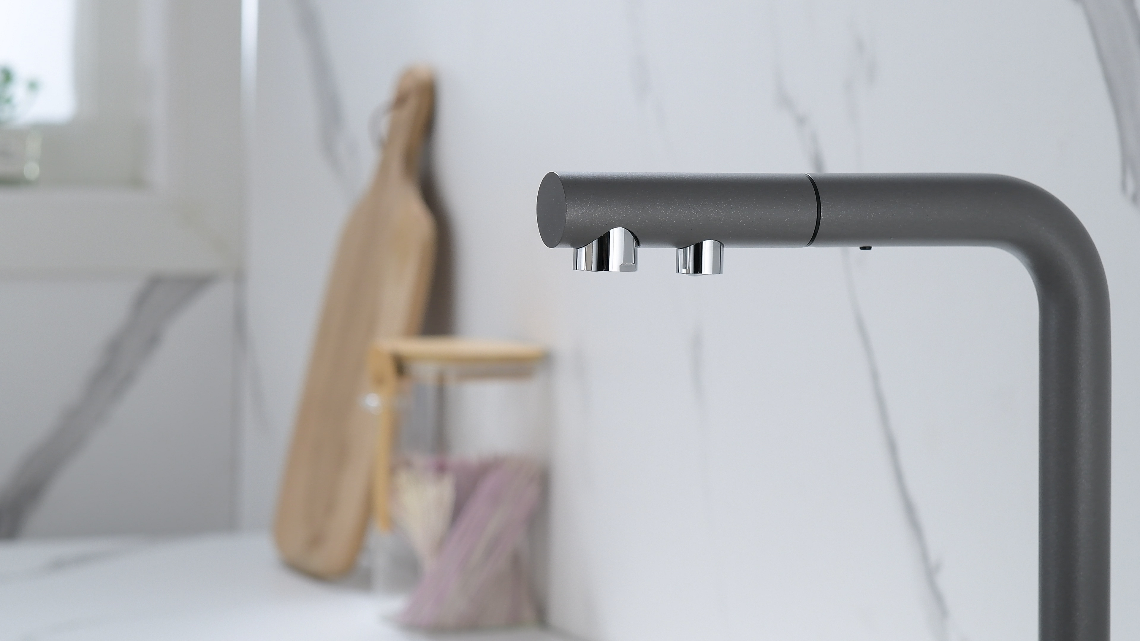 SERPENTINE оснащён функцией TRINKWASSER - излив смесителя имеет встроенный независимый канал для питьевой воды из фильтра, таким образом питьевая и водопроводная вода не смешиваются. Управление питьевой водой осуществляется отдельным рычагом, расположенным слева. Для пуска водопроводной воды используется большой рычаг справа.